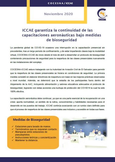 Las instalaciones del ICCAE han sido dotadas de estaciones para el lavado de manos y termómetros que no requieren contacto, al mismo tiempo mamparas entre las estaciones de pseudopilotos. Además, el regreso de los participantes se está haciendo con modalidad virtual para la instrucción teórica de tal manera que se reduzca la estadía impactando en el cuidado de los participantes.