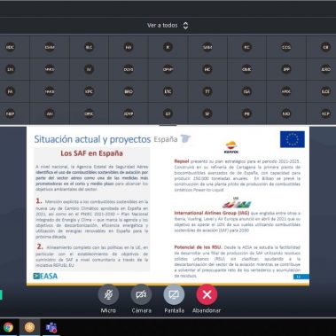 Asimismo, en materia de combustibles sostenibles de aviación (SAF) se resaltó el potencial que la región latinoamericana tiene para este tipo de iniciativas, asimismo se presentaron ejemplos de aplicación de tecnologías apropiadas. Se ponderó la importancia de como una de las principales medidas promovidas desde la OACI para alcanzar las metas aspiracionales en materia ambiental y de cambio climático del sector aéreo internacional, indicando que actualmente ya se están desarrollando diferentes proyectos de producción de SAF. Además, se vinculó que éstos son una medida muy importante para la descarbonización del sector aéreo.